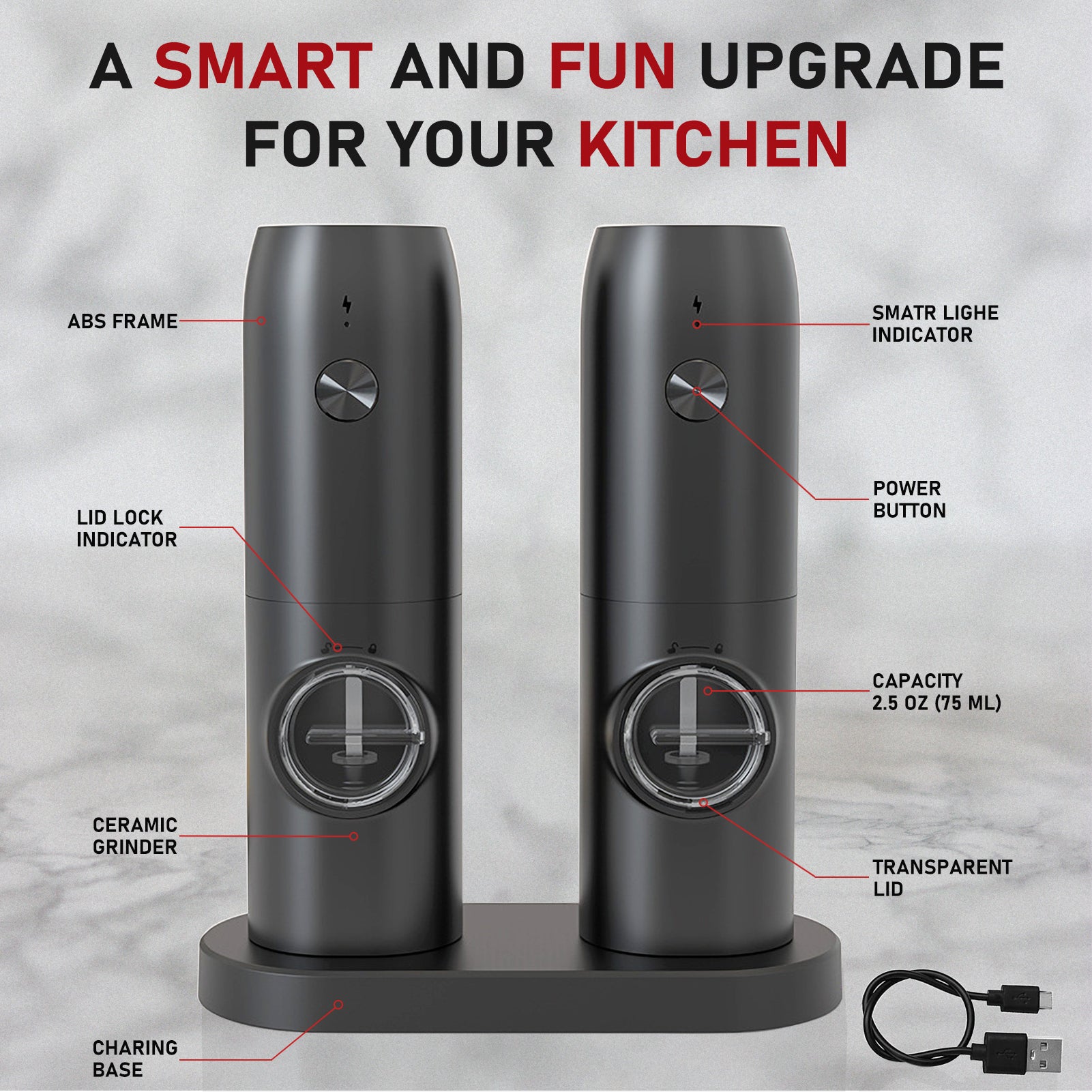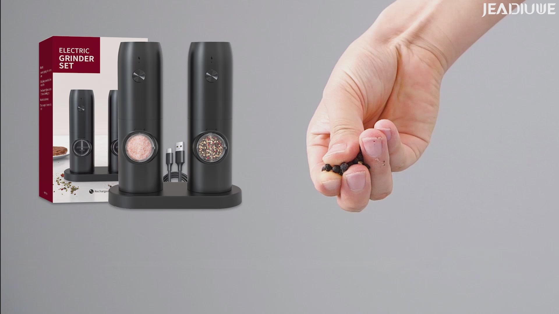 - 【USB charging base】Jeadiuwe salt and pepper grinder set rechargeable,Type-C charging dock,It can be used to store 2 pepper and salt grinders,Adopting advanced charging technology, both for charging and storage,Only a USB charging cable is needed, no need to waste a lot of money on batteries.
